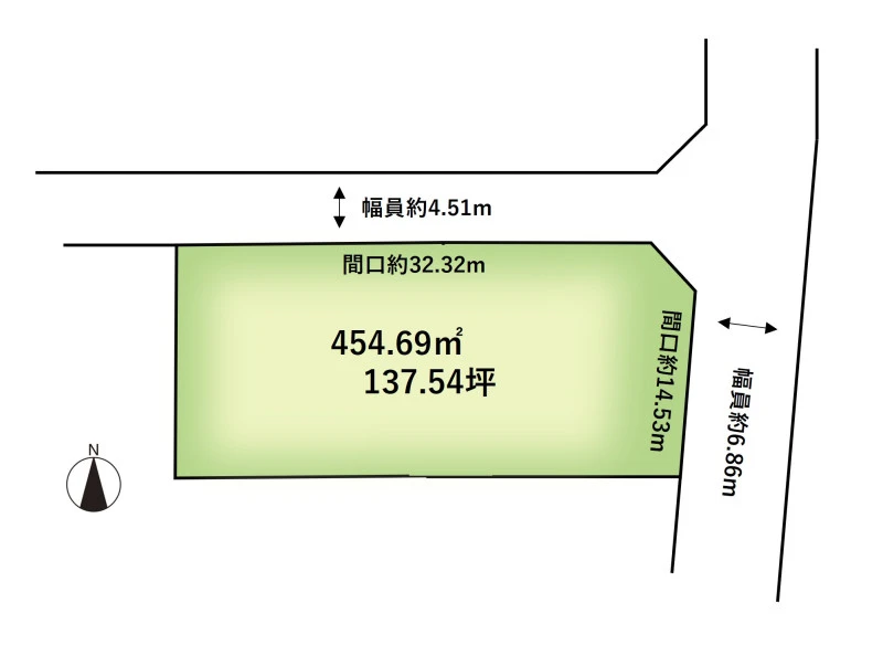 角地 北 間口32.32m 公道 幅4.51m 位置指定無 東 間口14.53m 公道 幅6.86m 位置指定無 |