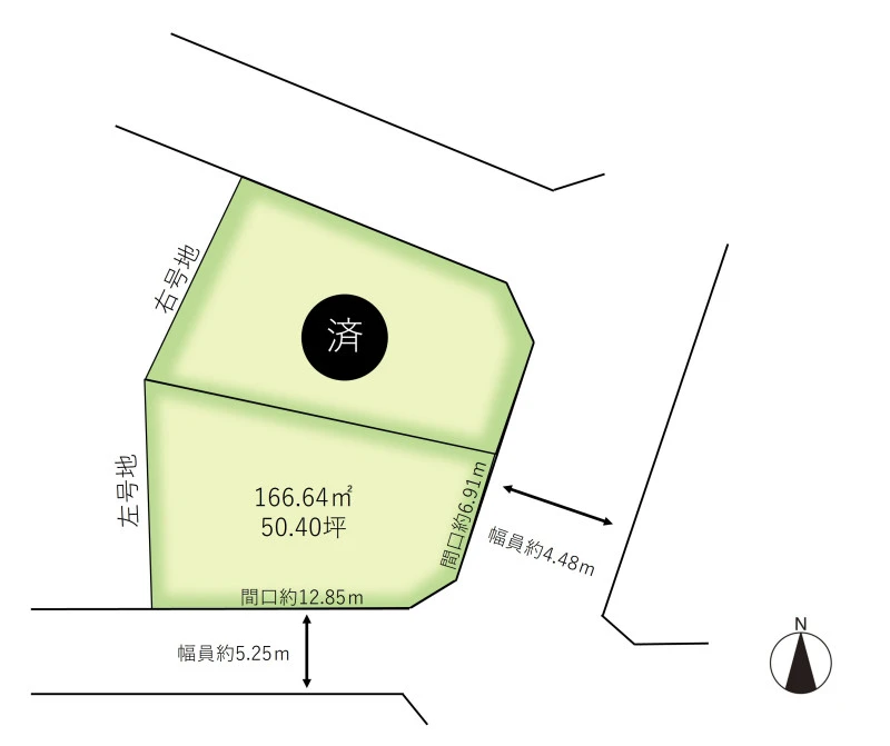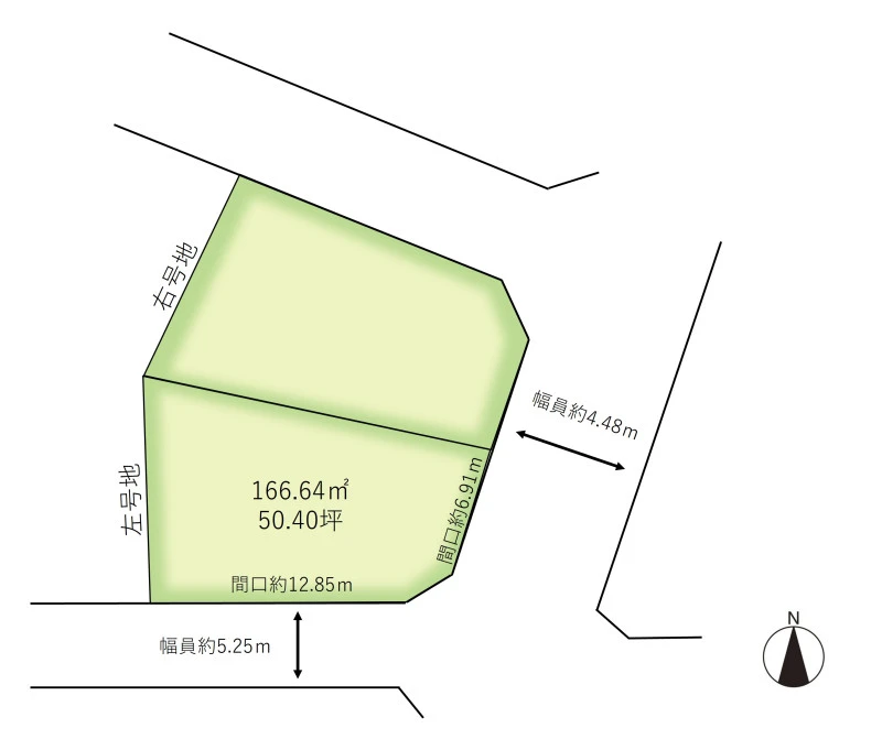 角地 東 間口6.91m 公道 幅4.48m 南 間口12.85m 公道 幅5.25m |