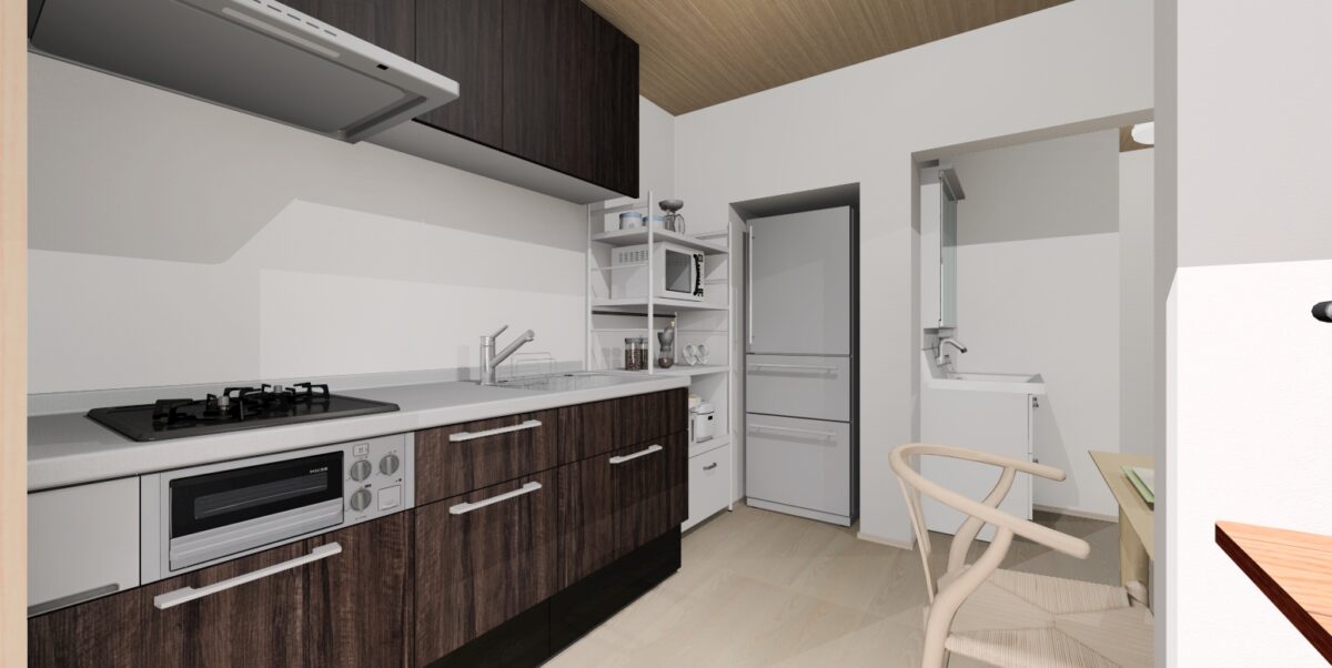 ※内観パースはイメージ画像です IHクッキングヒーター付きのシステムキッチンです 冷蔵庫のスペースもあり、キッチン周りを広々と使うことができます