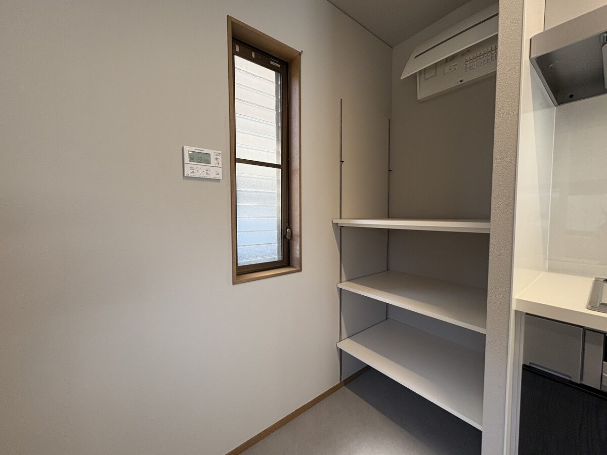 キッチン横稼働棚です。キッチンスペースは広々としており、収納スペースも豊富で食糧の保管場所にも困りません!