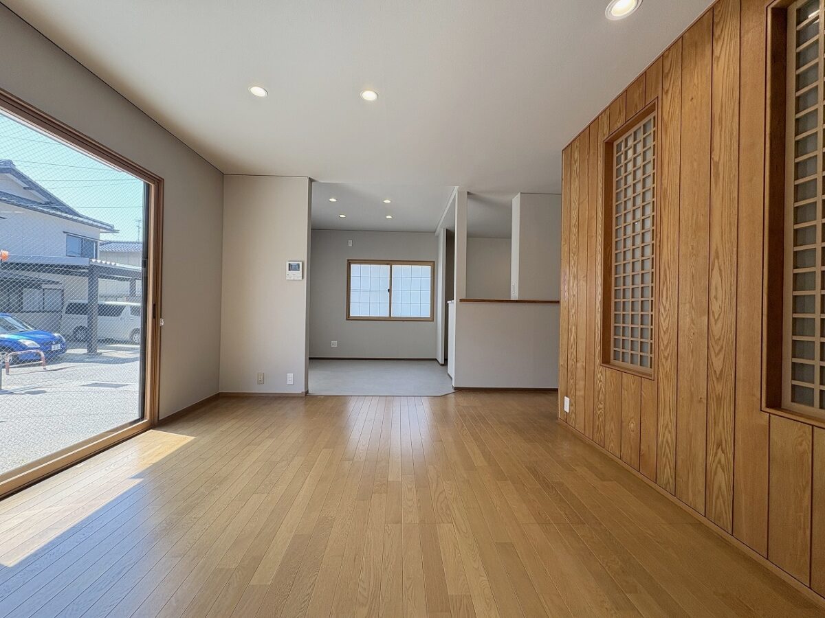 LDK約20.0帖です。アクセントであるリビングの板張りを残しつつ、内装を変更しました。