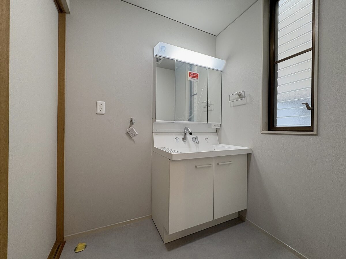 三面鏡の独立洗面台です。最新の設備機器で使いやすく、お掃除もしやすいです