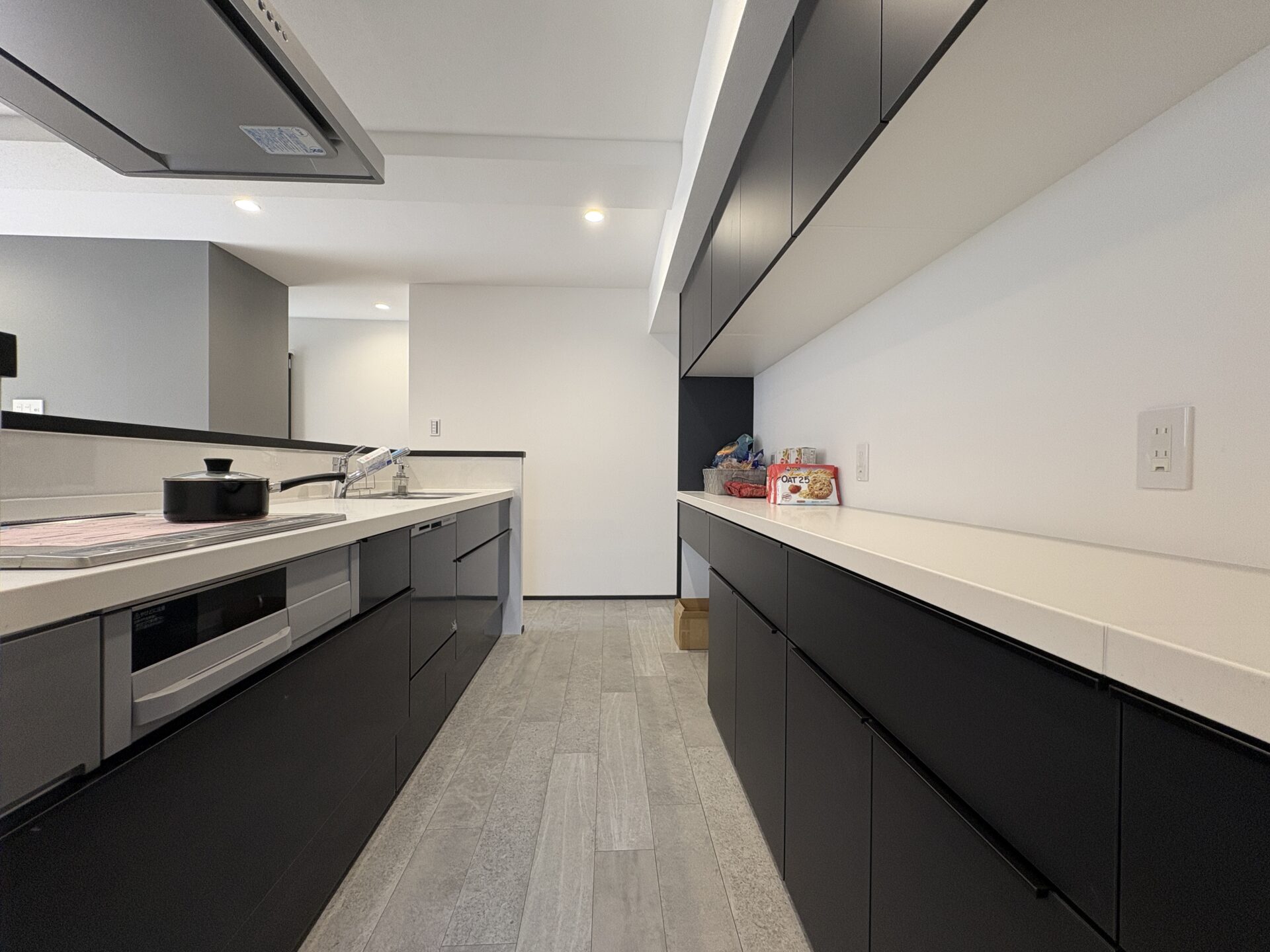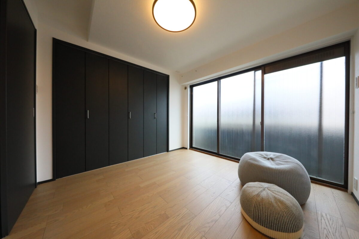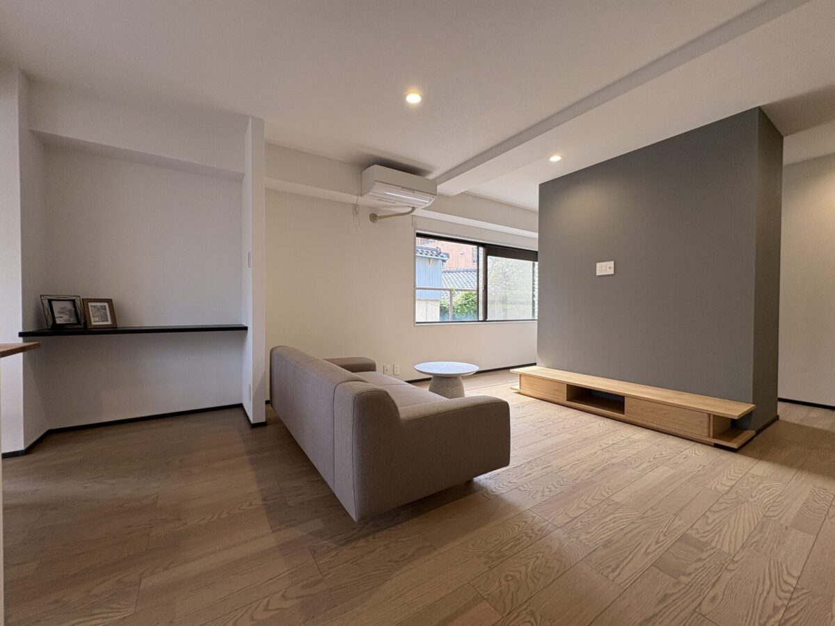 金沢中心街・竪町ストリートへ徒歩圏内 LDKは、場所ごとに異なる寛ぎを演出するゾーニング設計 キッチン背面には大容量のカップボード収納を設け、日常使いの収納力も抜群です 寝室には壁面収納を配置し、洋服やバッグ、小物まで細かく整理 さらに、玄関ホールにはシューズクロークとストック収納を新設し、空間をすっきりと保ちます 都心の便利さと、自分らしい時間を楽しむ心地よさを両立したリノベマンション