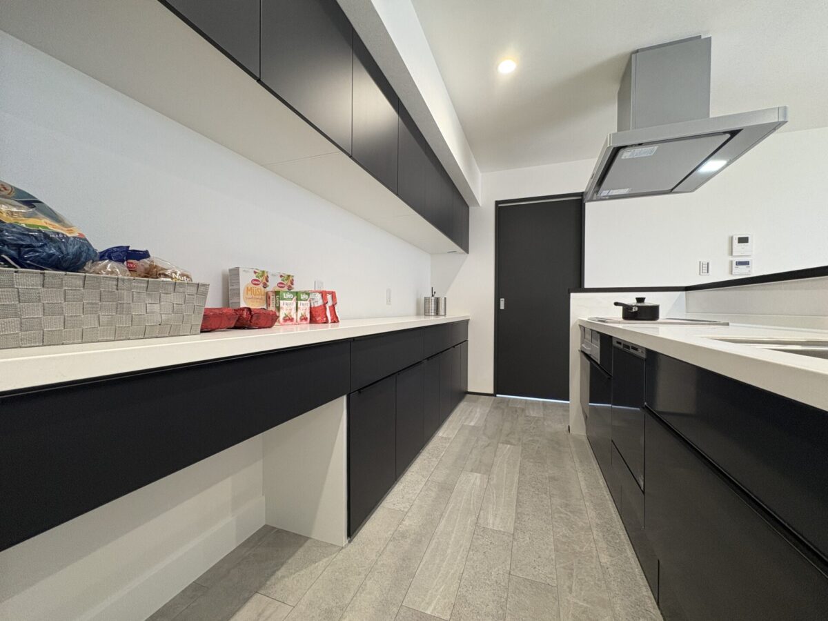 キッチン背面にはカップボード収納を設けています