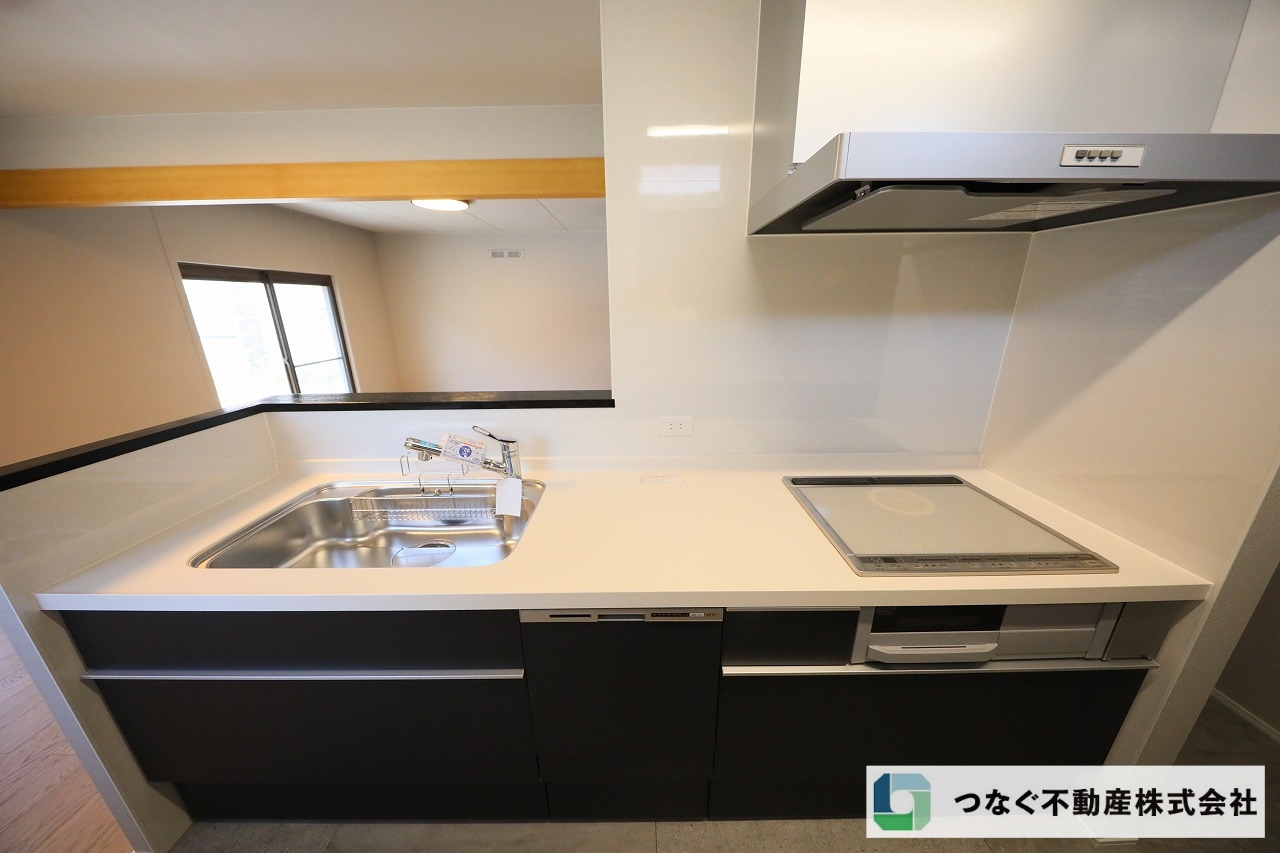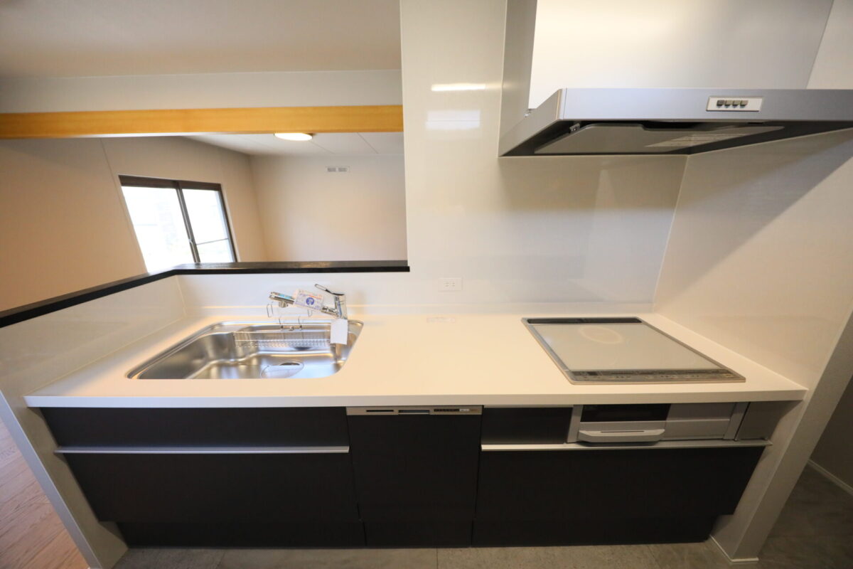 キッチンは横つながりでリビングが見渡せる作りになっています